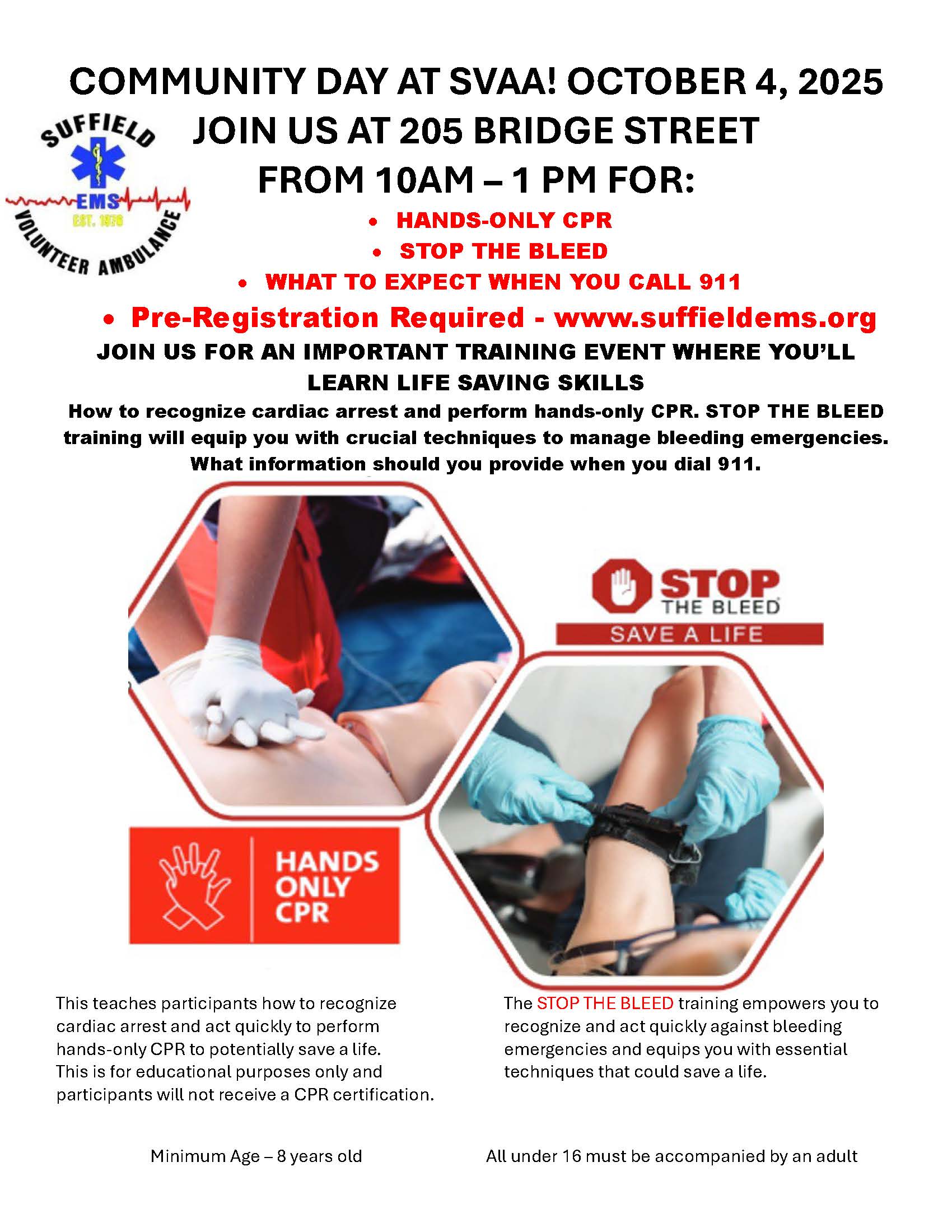 Hands Only CPR class along with Stop the Bleed and What to Expect When you Call 911. There is no cost for this event.